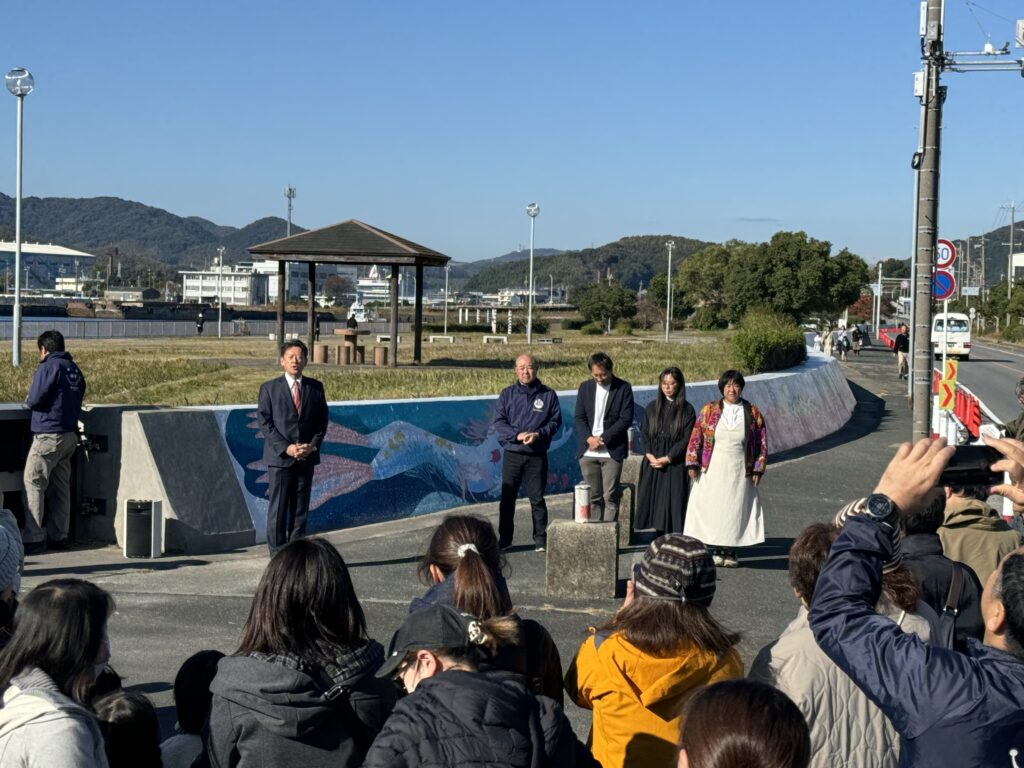 本日は、蒲郡市制施行70周年を記念して、市民会館の南側に位置する堤防に絵を描くプロジェクトの完成式が行われました。テーマは「蒲暦(がまこよみ)−30年後も愛し続けたい蒲郡−」